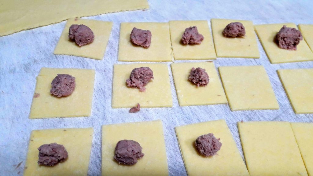 Puis j’ai fait des petits carrés d’environ 2 cm de côté, et posé un peu de farce dessus.