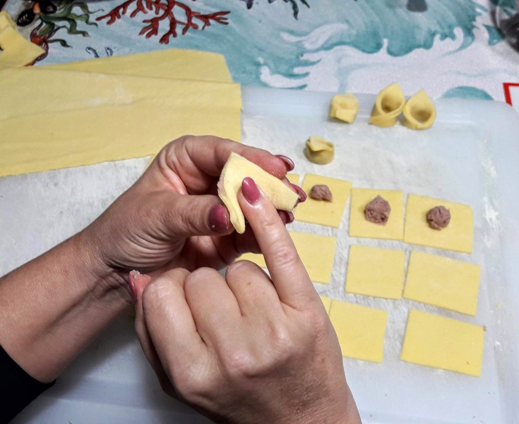 J’ai fermé le sommet supérieur, et en saisissant les extrémités inférieures, j’ai mis mon petit doigt au milieu, et j’ai enroulé tout le tortellino autour, en faisant coïncider les deux pointes de base.