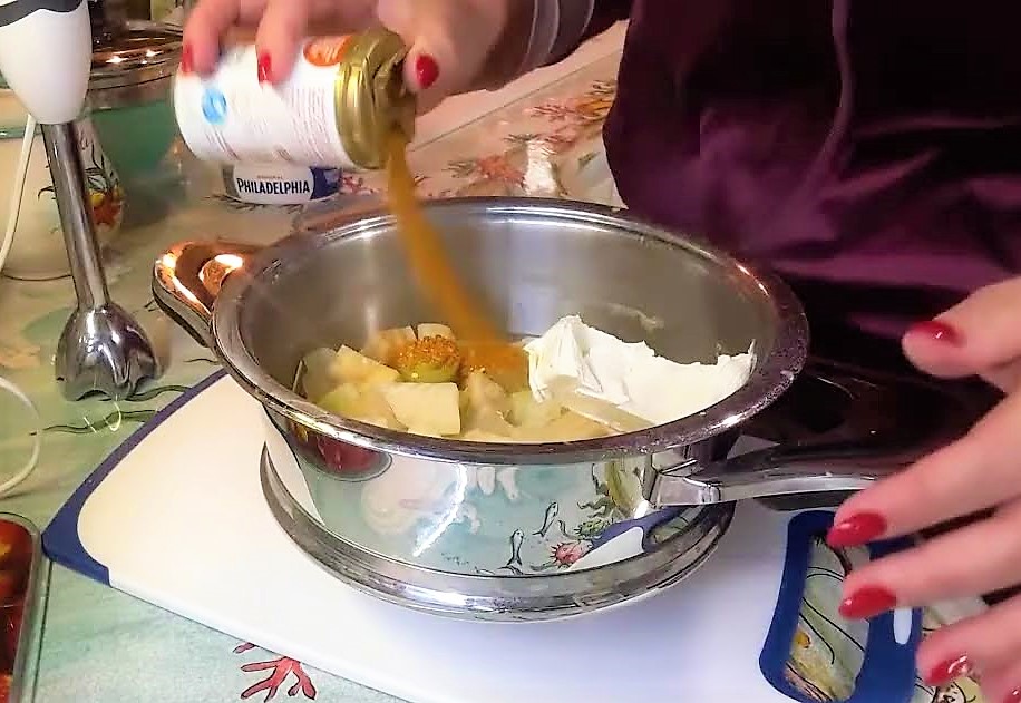 Une fois le temps écoulé, versez dans les légumes le fromage à tartiner, les épices, et l’huile d’olive extra vierge,