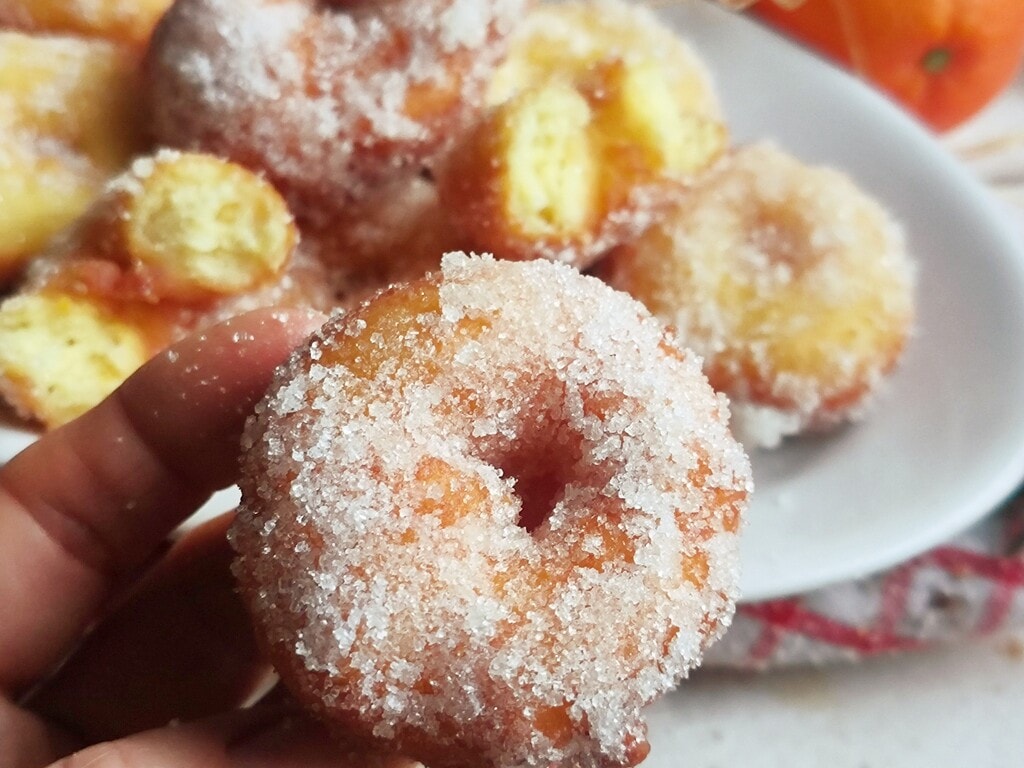 Étalez la pâte, elle ne doit pas être fine sinon les beignets seront très plats, avec un emporte-pièce rond pour biscuits, découpez de nombreux cercles, j’ai utilisé un petit emporte-pièce rond car je voulais faire des petits beignets, donc choisissez la taille que vous souhaitez. Une fois que vous avez découpé les cercles, faites un trou au centre, j’ai utilisé le manche d’une cuillère en bois. Chauffez bien l’huile, si vous avez un thermomètre, laissez-la atteindre 160 degrés, sinon faites le test avec le manche d’une cuillère en bois, si en l’immergeant dans l’huile il fait des bulles, alors l’huile est prête pour la friture. Frire peu de beignets à la fois, les égoutter sur du papier absorbant et avant de les enrober de sucre, les tremper dans le jus d’orange puis les plonger dans le sucre, c’est le truc pour les garder moelleux même le lendemain sinon les passer immédiatement dans le sucre. Dégustez-les et vous verrez quelle délice.