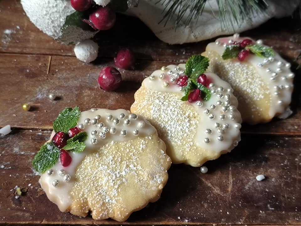 Ici, j’ai utilisé un emporte-pièce rond, des petites billes de sucre argentées, des graines de grenade et des petites feuilles de menthe. Puis j’ai fait un glaçage avec du sucre glace et de l’eau. Enfin, j’ai saupoudré de sucre glace.