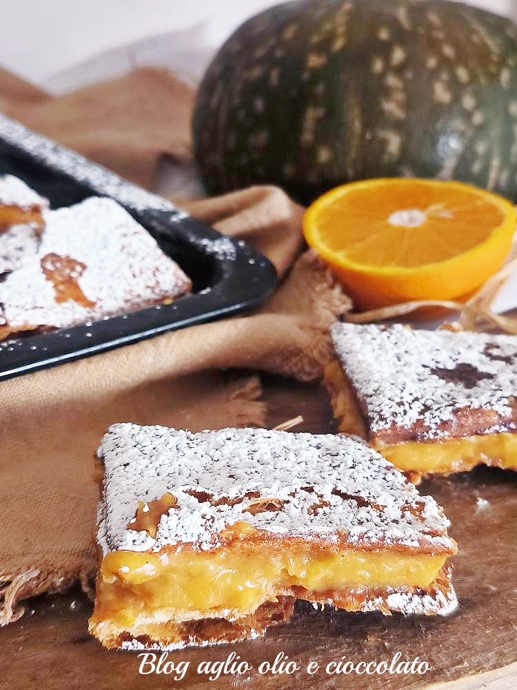 L’ingrédient qui rend ce dessert vraiment spécial est précisément la crème de potiron et d’orange, qui se marie parfaitement avec le croûte croustillante de la pâte feuilletée, une combinaison qui conquiert dès la première bouchée mais si tu ajoutes des pépites de chocolat ou mieux encore des morceaux de chocolat noir, les feuilletés seront encore plus gourmands et croustillants à chaque bouchée. Essaie-les et fais-moi savoir comment tu les as personnalisés.