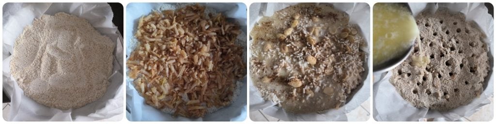 COMPLÉTER LE GÂTEAU: Tapissez un moule d’environ 22 cm avec une feuille de papier sulfurisé, ajoutez une partie des poudres dans le moule, égalisez bien avec une cuillère, ajoutez une partie des pommes râpées, nivelez bien, faites une autre couche avec les poudres et ensuite encore les pommes, vous devez finir avec les poudres. Avec un cure-dent pour brochettes, faites des trous sur toute la surface du gâteau. Faites fondre le beurre dans le lait et laissez-le tiédir, puis versez-le sur toute la surface du gâteau en le faisant tomber dans les trous, saupoudrez de sucre en grains, de sucre glace et de cannelle, puis ajoutez des amandes et enfournez à 180 degrés, pendant environ 35 minutes mais adaptez-vous à votre four et faites le test du cure-dent, cela pourrait prendre quelques minutes de plus. Sortez du four et saupoudrez de sucre glace. Laissez bien refroidir avant de déguster.