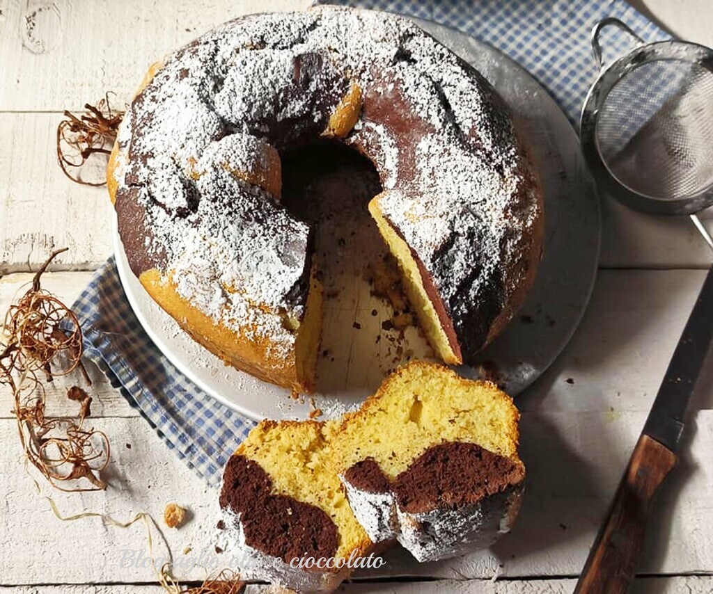 Dans un bol, battez très bien les œufs avec le sucre, ils doivent être bien gonflés, ajoutez en filet la crème, puis l’arôme et enfin la farine avec la levure. Divisez la pâte en deux bols, un avec moins de pâte et ajoutez-y le cacao, mélangez bien puis versez dans un moule à gâteau beurré et fariné d’abord la pâte blanche puis avec une cuillère, ajoutez aussi celle au cacao. Enfournez à 180 degrés pendant environ 40 minutes mais si vous le souhaitez, vous pouvez aussi cuire le gâteau dans la friteuse à air à 200 degrés pendant 20 minutes. Sortez du four et saupoudrez de sucre glace.