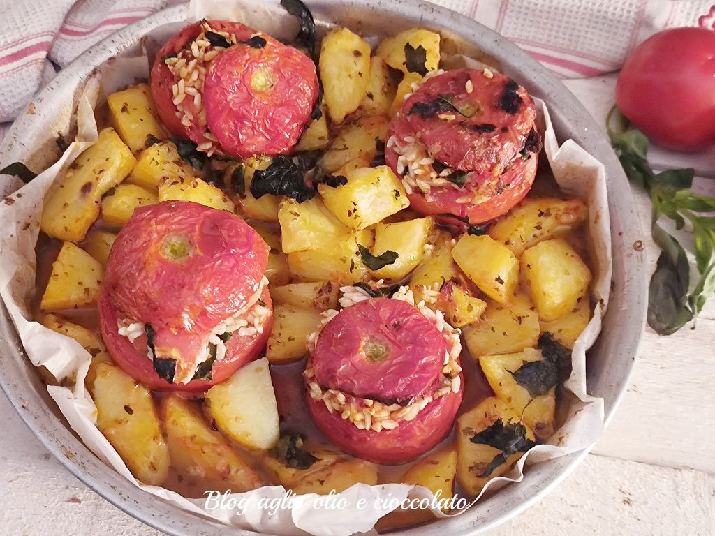 Remplissez maintenant les tomates avec le riz que vous avez mis de côté et ce qui reste, répartissez-le sur les pommes de terre, ajustez encore avec du sel, de l’huile, du basilic et de l’origan, et enfin ajoutez l’eau. Faites cuire le tout dans la friteuse à air pendant 20 minutes à 200 degrés. Vérifiez la cuisson et, si nécessaire, prolongez un peu le temps. Les fantastiques tomates au riz à la romaine sont prêtes à être dégustées.
