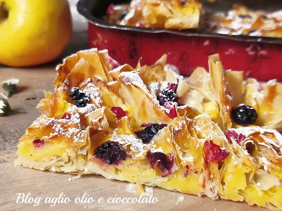 Tarte avec pâte filo, pommes et fruits des bois, un dessert très gourmand et très croquant qui fait crunch à chaque bouchée même le lendemain. Après avoir fait la version au chocolat, vous la trouvez ici, il ne pouvait manquer la version avec les pommes et les fruits des bois que j’adore d’ailleurs. Elle se prépare en très peu de temps et avec très peu d’ingrédients, évidemment celui qui la rend si croquante est la pâte filo que vous trouvez facilement au supermarché, mais si vous voulez, vous pouvez aussi la faire à la maison. Il vous suffit de beurrer les couches et d’ajouter un mélange d’œufs et le croquant sort à merveille. Je vous conseille de l’essayer et je suis sûre que vous la ferez souvent comme moi. Voyons ce dont nous avons besoin pour faire la Tarte avec pâte filo, pommes et fruits des bois.