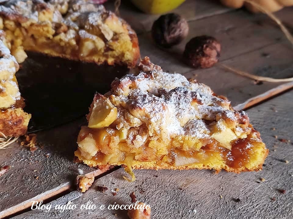 Tarte rustique aux pommes, potiron et noix, un dessert d’aspect rustique mais avec une pâte très moelleuse et un cœur crémeux de confiture et de pommes très invitant. Cette fois, le potiron se trouve directement dans la pâte, il s’agit en effet d’une pâte sablée au potiron et je dois dire que c’est un vrai délice. Je l’ai garnie de confiture et j’ai émietté un mélange de sablé, pommes et noix qui donnent un croquant vraiment agréable !! Essayez-la et vous verrez quelle merveille. Voyons ce qu’il nous faut pour faire la tarte rustique aux pommes, potiron et noix.