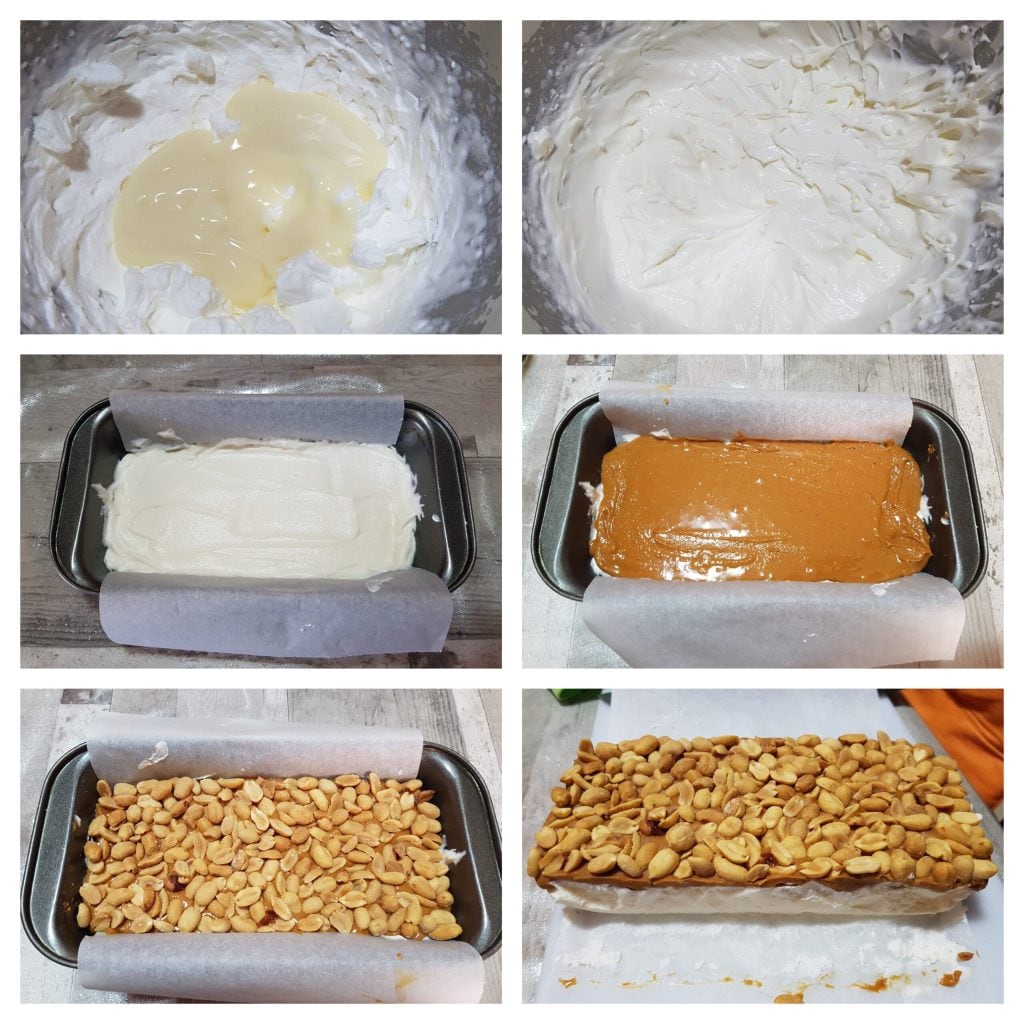 Pour réaliser ces délicieuses barres, il faut d’abord préparer la base de glace astucieuse. Dans un bol, monter avec des fouets électriques la crème fraîche liquide bien froide du réfrigérateur, lorsqu’elle est bien ferme, ajouter lentement le lait concentré froid du réfrigérateur jusqu’à obtenir une pâte mousseuse. Prendre un moule à cake de 26-28 cm et le tapisser de papier sulfurisé, verser la base de glace sur le fond du moule en lissant parfaitement et placer au congélateur pour raffermir environ une heure. Reprendre le moule du congélateur et verser le beurre de cacahuètes pour former une couche parfaitement alignée. Répartir les cacahuètes et mettre au congélateur pour raffermir encore 5-6 heures ou toute la nuit.