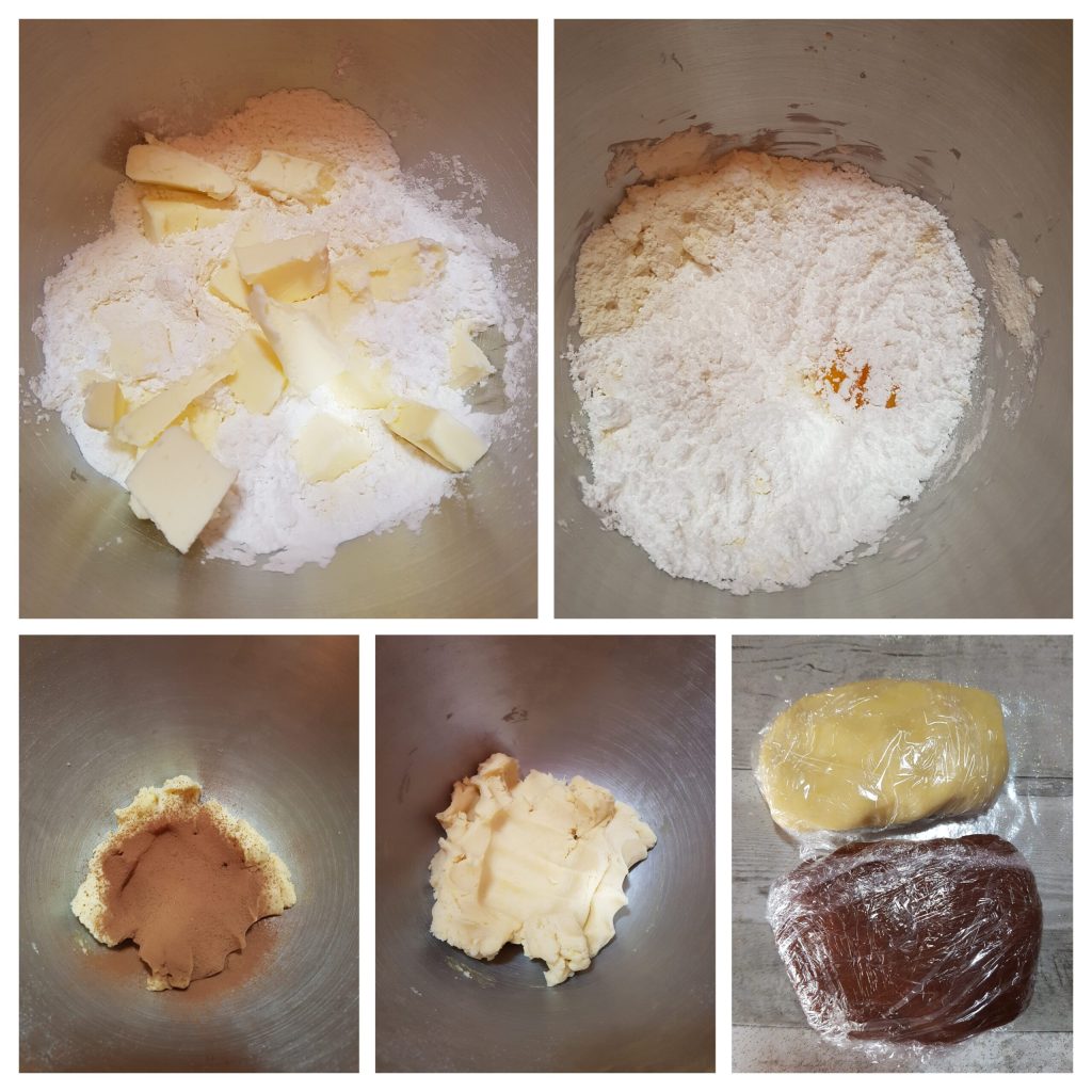 Pour réaliser ces jolis biscuits en forme de cœur, il faut préparer la pâte. Vous pouvez faire la pâte sablée à la main en utilisant un bol. Pour ma part, j’ai utilisé le robot pâtissier. Dans le bol du robot, verser les deux farines tamisées, le beurre froid coupé en morceaux, l’essence de vanille, le sel, la levure chimique et mélanger le tout en utilisant le fouet feuille (K) à vitesse 1-2. Une fois le « sablé » réalisé, appelé ainsi car le mélange ressemble à du sable, ajouter le sucre glace et l’œuf et mélanger encore jusqu’à obtenir une pâte lisse et homogène. Diviser la pâte en deux, dans l’une ajouter le cacao amer en poudre tamisé et bien incorporer, si nécessaire ajouter du lait pour obtenir une pâte homogène. Une fois les deux pâtes obtenues, les envelopper dans du film alimentaire et laisser reposer au réfrigérateur pendant 1 heure.