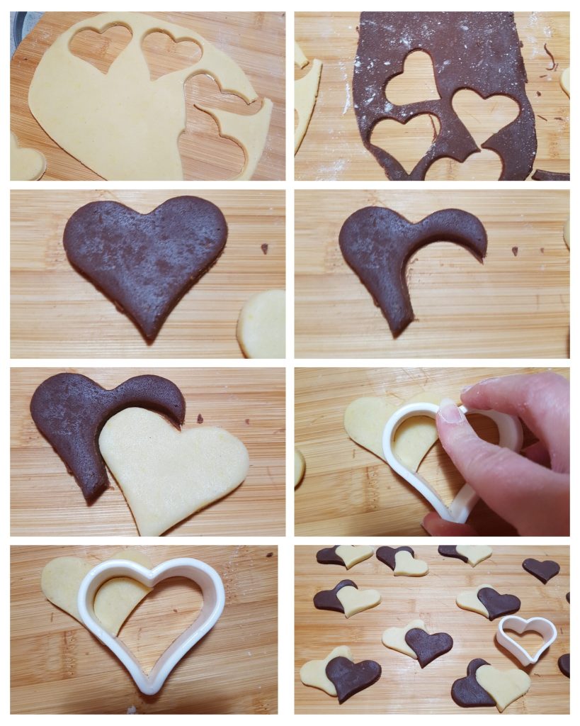 Reprendre les deux pâtons de pâte sablée du réfrigérateur, les travailler avec les mains et sur un plan de travail fariné, en utilisant un rouleau à pâtisserie, étaler les deux pâtons d’une épaisseur d’environ 4 mm et former des cœurs à l’aide de l’emporte-pièce en forme de cœur. Avec le découpoir, retirer une partie du cœur (voir photo) et l’ajuster avec l’autre biscuit en forme de cœur entier de couleur différente (voir photo). Continuer ainsi en alternant les couleurs des différents biscuits en forme de cœur.