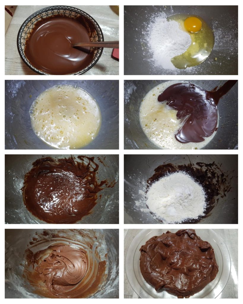 Pour réaliser ces délicieux biscuits moelleux au chocolat, il faut d’abord préparer la pâte. Faire fondre au bain-marie dans une casserole le chocolat noir haché et le beurre. Laisser refroidir quelques minutes. Dans un bol, utiliser un fouet pour battre le sucre glace avec les œufs jusqu’à ce qu’ils deviennent blanchâtres, ajouter le chocolat noir fondu et mélanger soigneusement. Enfin, ajouter la farine, le sel et la levure et mélanger soigneusement jusqu’à obtenir un mélange doux et homogène. Transférer la pâte au réfrigérateur pendant 30 minutes.