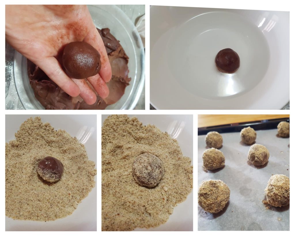 Reprendre la pâte au réfrigérateur et détacher avec les mains de petites quantités de pâte, environ 25 g chacune, et former des boulettes. Dans un bol, verser de l’eau et dans un autre les noisettes réduites en poudre. Tremper les boulettes d’abord dans l’eau puis dans la poudre de noisettes de façon à ce qu’elles soient complètement couvertes. Déposer chaque biscuit sur une plaque recouverte de papier sulfurisé en les espaçant. Cuire au four statique chaud à 170°C pendant 15-20 minutes.