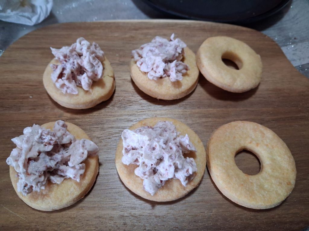 Garnissez chaque biscuit avec la mousse au salami, accouplez-les avec ceux qui n’ont pas de trou et disposez-les sur un plat de service avant de servir.