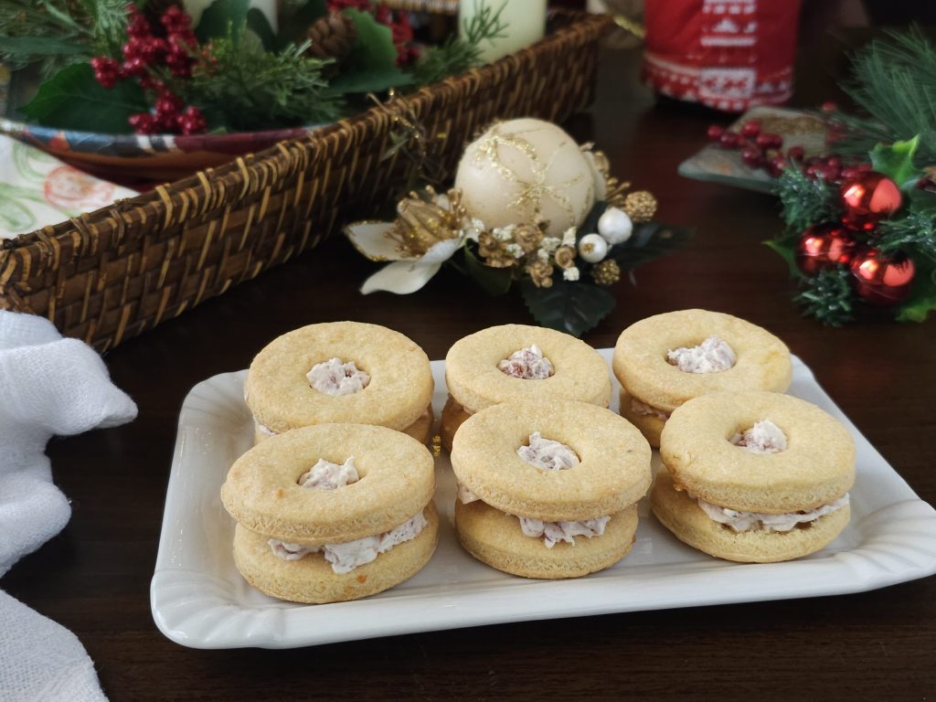 Pour réaliser ces biscuits salés, il est nécessaire de préparer à l’avance la pâte brisée salée. Je vous préviens que vous pouvez tout pétrir à la main, mais pour plus de commodité, j’ai utilisé le robot pâtissier. Dans le bol du robot, ajoutez la farine 00, le sel, le parmesan râpé, le beurre froid du réfrigérateur coupé en petits cubes et le poivre noir q.s. puis pétrissez à l’aide du fouet plat, c’est-à-dire le K, à vitesse 2 pendant quelques minutes jusqu’à l’obtention d’une pâte sableuse. Ajoutez enfin l’œuf et un peu de lait, puis pétrissez encore quelques minutes jusqu’à obtention d’une pâte compacte et homogène. Compactez bien la pâte brisée, enveloppez-la dans du film alimentaire et mettez-la au réfrigérateur pendant 30 minutes. Sortez la pâte brisée du réfrigérateur, travaillez-la un peu avec vos mains et, sur un plan de travail fariné, utilisez un rouleau à pâtisserie pour étaler une pâte de 2-3 mm d’épaisseur et découpez des disques à l’aide d’un emporte-pièce rond. Vous devez obtenir un nombre pair de biscuits, donc un biscuit entier circulaire et un autre biscuit avec un trou au centre réalisé simplement avec l’aide d’un autre emporte-pièce plus petit, ou avec une douille lisse de pâtisserie ou un vide-pomme. Disposez les biscuits sur une plaque recouverte de papier sulfurisé et faites cuire dans un four préchauffé à 180ºC pendant 13-15 minutes ou jusqu’à légère dorure. Éteignez le four, sortez les biscuits et laissez refroidir.