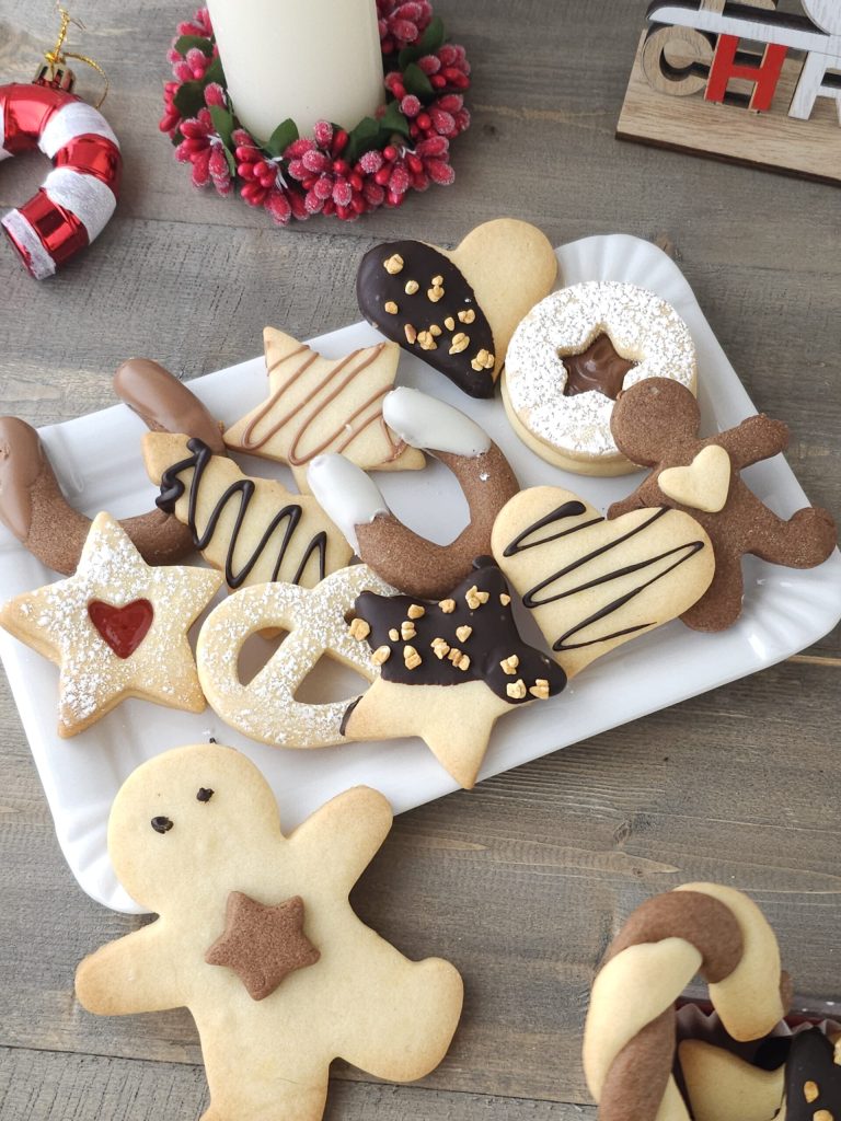 • Lorsque les biscuits sont cuits et refroidis, décorez-les à votre goût en utilisant du chocolat noir, blanc et au lait préalablement fondu. Laissez-les ensuite sécher complètement pendant une heure. Pour les biscuits fourrés, vous pouvez utiliser de la confiture ou du Nutella. Si vous utilisez la forme du biscuit hollandais, il suffit de le glacer avec du chocolat blanc et de le tremper ensuite dans du sucre en poudre. Et les voilà prêts, il suffit de remplir la boîte ou un contenant en métal et de les offrir ou de les servir à vos invités. J’espère que cette dernière recette vous plaira, à bientôt mes amis.