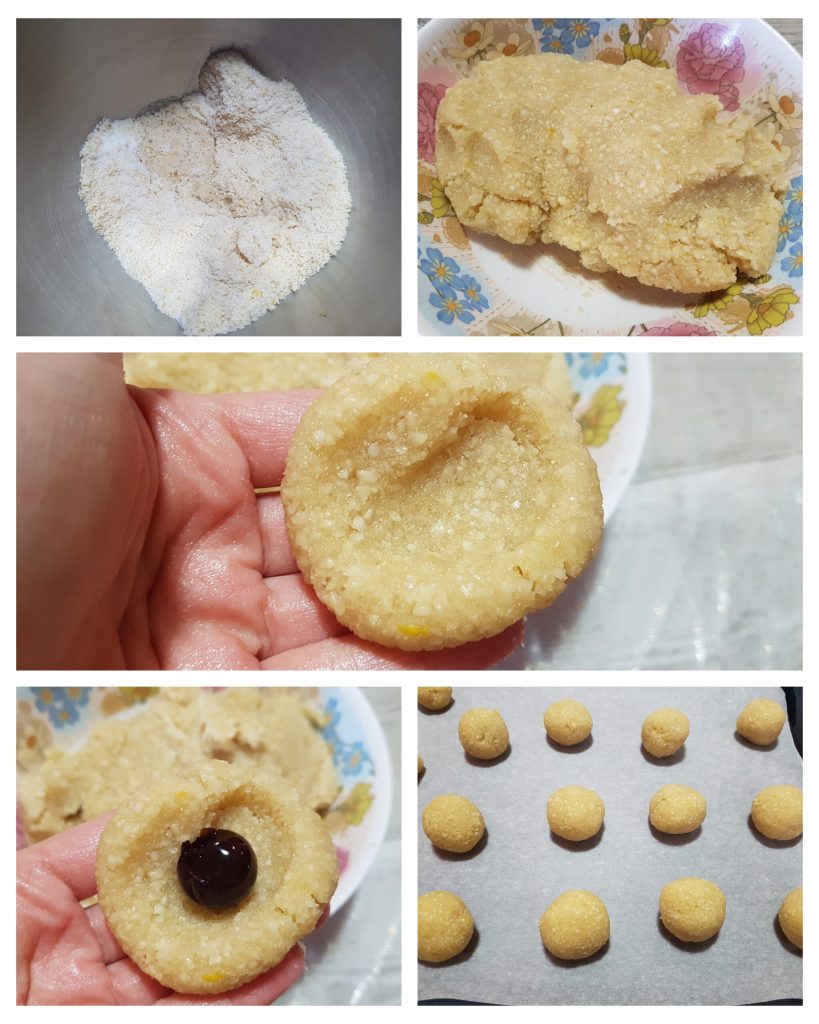 Pour commencer à réaliser ces bonbons aux amandes, il faut broyer finement les amandes. Préchauffer le four à 170°C. Verser dans le bol la farine d’amande obtenue, le sucre en poudre, tous les arômes secs et liquides, les blancs d’œufs, et pétrir pendant quelques minutes avec une spatule ou avec les mains pour obtenir une pâte homogène et collante. Une fois la pâte prête, former des petites boules de 20-30 g chacune et placer au centre de chaque boule une griotte au sirop. Bien refermer et les disposer sur une plaque recouverte de papier sulfurisé. Cuire pendant 10-12 minutes à 170°C. Ne pas les cuire plus longtemps sinon ils pourraient devenir durs. Éteindre et les laisser refroidir complètement.