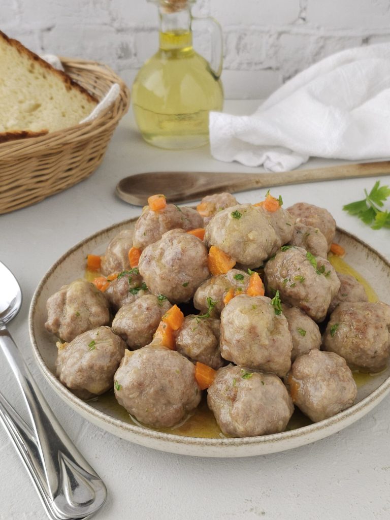Dans une grande poêle, ajouter l’huile d’olive extra vierge, l’oignon haché et faire revenir pendant quelques minutes. Ajouter les carottes et continuer à faire revenir pendant 5 minutes. Disposer les boulettes et les faire cuire quelques minutes de chaque côté, en scellant bien la viande. Dès que vous voyez une croûte se former, déglacer avec le vin blanc et laisser évaporer. Ajuster le sel et le poivre et commencer à cuire les boulettes en les arrosant de bouillon petit à petit. Cuire avec un couvercle pendant environ 30 minutes ou jusqu’à ce que les boulettes soient tendres et qu’une petite sauce se forme.