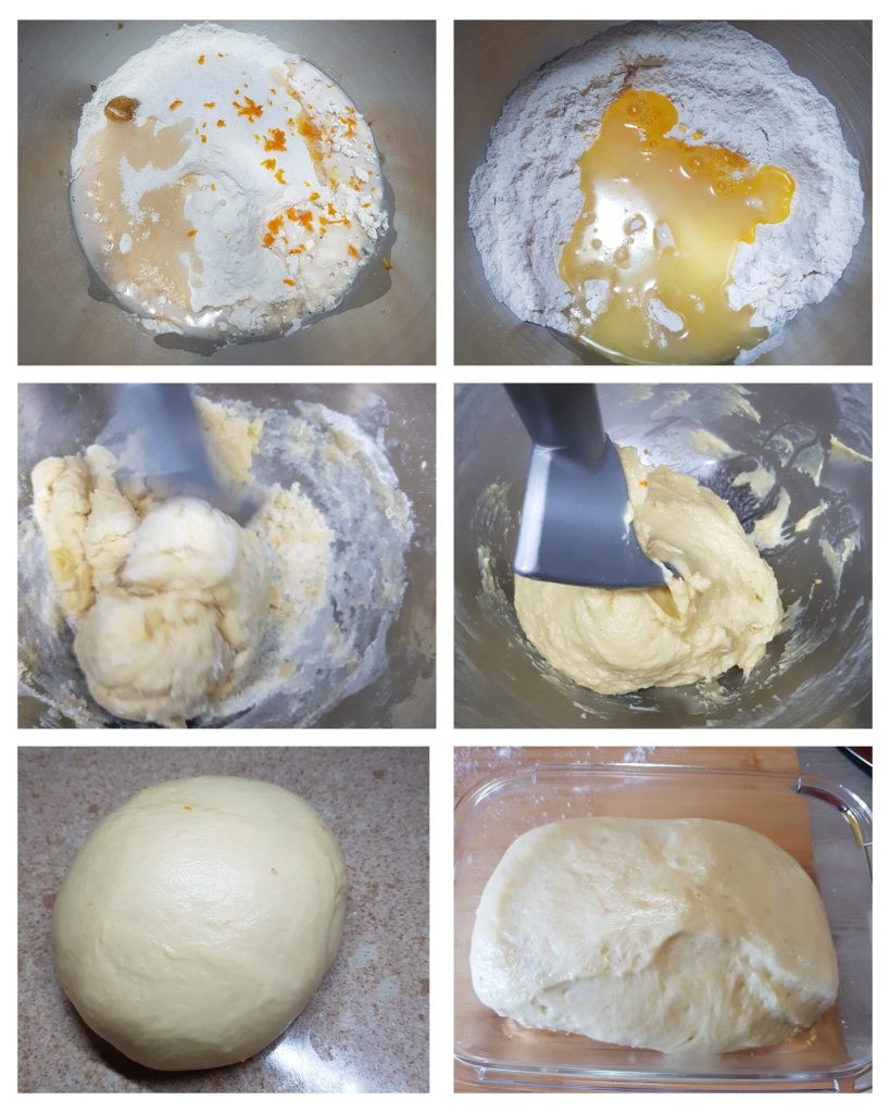 Pour préparer ces gourmandes brioches farcies, il faut d’abord réaliser la pâte à brioche. J’ai utilisé le robot de cuisine mais vous pouvez tout pétrir à la main dans un grand saladier puis sur un plan de travail. Dans le bol du robot, mettre la farine tamisée, la vanille, le zeste râpé de l’orange, la levure de boulanger dissoute dans deux doigts de lait et le sucre en poudre, et pétrir pendant quelques minutes à vitesse 1-2 en utilisant le crochet pétrisseur. Ajouter ensuite l’œuf et laisser pétrir encore un instant. Puis ajouter petit à petit le lait restant en filet et continuer à pétrir. Ajouter également le sel. Enfin, petit à petit, ajouter le beurre mou en morceaux, le faire bien absorber et continuer à pétrir. Pour obtenir une pâte lisse et homogène, il faudra en tout environ 15-18 minutes ou jusqu’à ce que la pâte soit bien cordée. Laisser lever la pâte dans un grand saladier couvert de film alimentaire pendant environ 2-3 heures dans le four avec la lumière allumée.