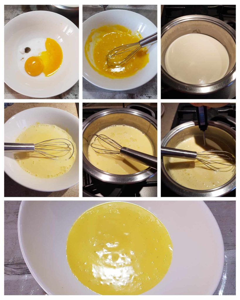 Pour réaliser cette délicieuse bûche glacée au tiramisu, il faut d’abord préparer la crème au mascarpone. Nous commençons par une simple crème anglaise. Dans un petit bol, faire tremper la gélatine dans de l’eau froide. Dans une petite casserole, faire chauffer la crème avec la gousse de vanille ou l’essence de vanille. Dans un bol, battre les jaunes d’œufs avec le sucre sans trop les fouetter. Ajouter la crème chaude au mélange d’œufs en mélangeant soigneusement. Puis verser le tout dans la casserole et continuer à cuire en remuant avec une cuillère jusqu’à atteindre 82°-85°, si vous n’avez pas de thermomètre, la crème est prête lorsque la cuillère est nappée. Essorer la gélatine et l’ajouter à la crème anglaise. Mélanger soigneusement et filtrer à l’aide d’un tamis. Laisser refroidir à température ambiante pendant 30 minutes dans un bol, en couvrant avec un film alimentaire, puis placer au réfrigérateur toute la nuit ou environ 6 heures.