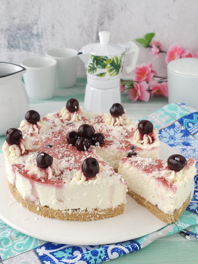 cheesecake noix de coco et cerises amarena vraiment très facile à réaliser. L’association de la noix de coco et des cerises amarena vous surprendra. Vous trouverez la recette ci-dessous..