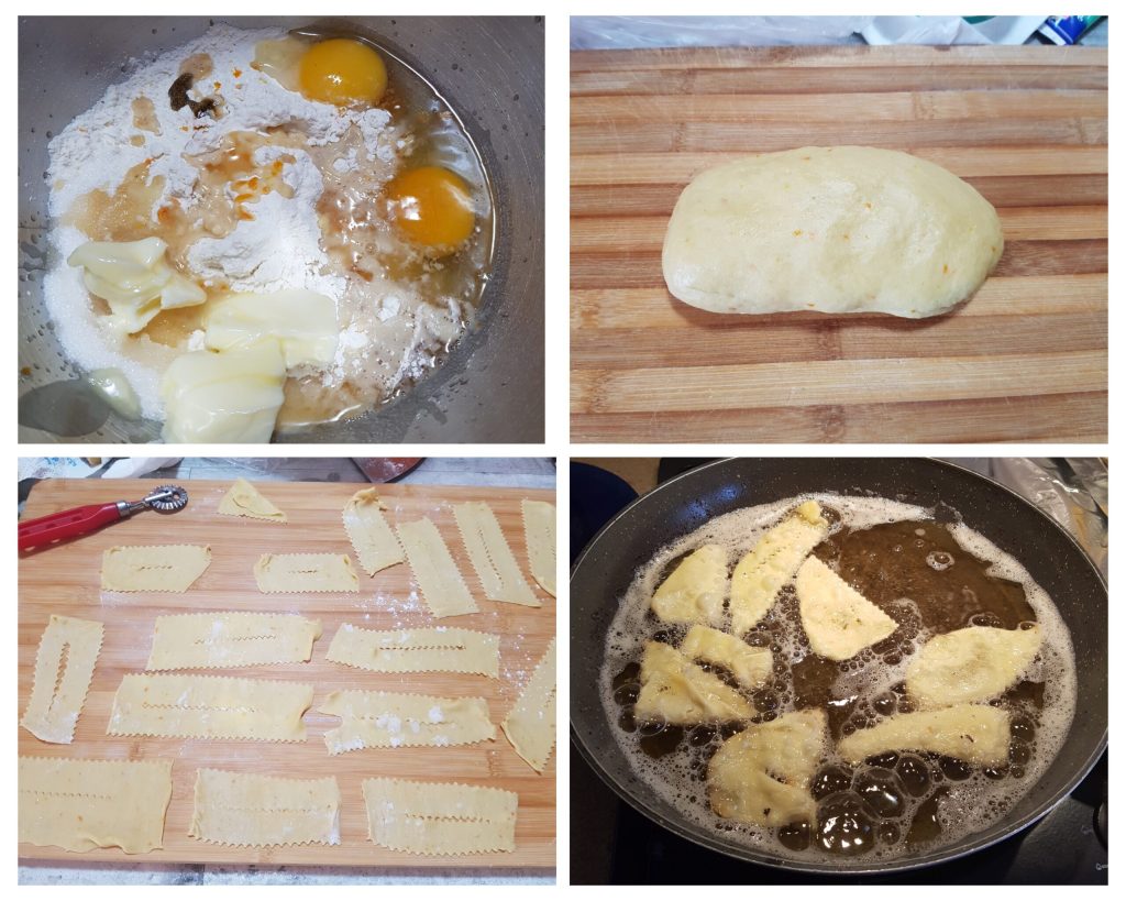 • Pour réaliser ces délicieuses chiacchiere, pâte infaillible, il faut verser dans le bol d’un robot de cuisine tous les ingrédients en commençant par les deux farines tamisées, le sucre semoule, les œufs, le rhum et le beurre mou. Ajouter ensuite le sel et le zeste râpé d’un citron et d’une orange et l’essence de vanille. Actionner la machine en insérant le crochet (K) et commencer à pétrir à une vitesse minimale jusqu’à atteindre une vitesse de 2-3 soit moyenne. Lorsque vous obtiendrez une belle boule lisse et homogène, la pâte est prête. Évidemment, vous pouvez très bien pétrir le tout à la main sur un plan de travail. Laisser reposer la pâte pendant 1 heure au réfrigérateur enveloppée dans du film alimentaire. Fariner ensuite un plan de travail et à l’aide d’un laminoir, commencer à étaler la pâte en partant du numéro 3 jusqu’à arriver au numéro 9 d’épaisseur. Elle devra être une feuille très fine. Avec une roulette dentelée ou crantée, découper ensuite des rectangles et faire une entaille verticale au centre. Dans une poêle, mettre l’huile de graines d’arachide et porter à température (170°- 175°), plonger les chiacchiere, peu à la fois, jusqu’à les faire dorer de chaque côté. Il faudra 30 secondes par côté. Les égoutter et les déposer sur un plateau recouvert de papier absorbant ou de papier pour friture.