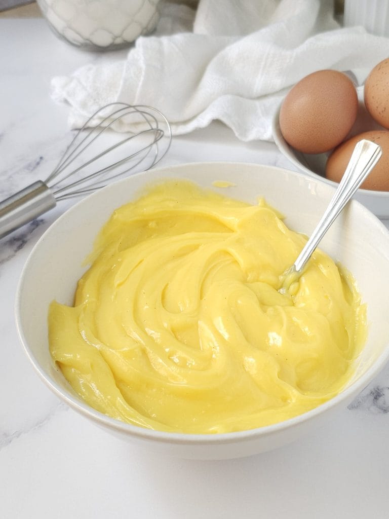 La crème pâtissière peut être préparée à l’avance. Elle se conserve au réfrigérateur pendant quelques jours ou peut être congelée pendant un mois. Le lait entier frais peut être remplacé par du lait entier sans lactose. Les œufs avec coquille doivent être de taille M (poids 60-70). La fécule de maïs peut être remplacée par de la fécule de riz mais la texture sera différente. Vous pouvez utiliser les deux fécules si vous le souhaitez. Pour doubler les quantités de la recette, il suffit de doubler les quantités des ingrédients. L’essence de vanille ou la gousse de vanille ou les graines de vanille peuvent être remplacées par du zeste de citron.