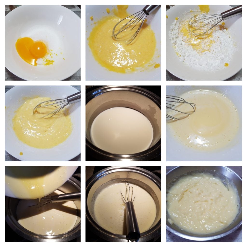 • Verser le lait dans une casserole et le placer sur le feu pour le chauffer. Dans un autre bol, battre les jaunes d’œufs avec le sucre, l’extrait de vanille et le zeste de citron râpé à l’aide d’un fouet. Ajouter ensuite la fécule de maïs et le sel et bien mélanger. Verser ensuite le jus de citron et mélanger. Ajouter le mélange d’œufs dans le lait et porter à ébullition en remuant continuellement avec le fouet pour éviter la formation de grumeaux et épaissir complètement. Retirer du feu, placer un film alimentaire au contact et laisser refroidir à température ambiante pendant quelques heures.