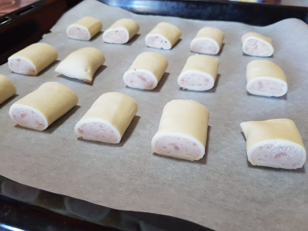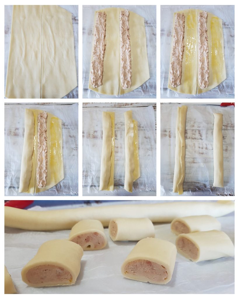 Pour réaliser ces délicieux feuilletés au thon, il faut dérouler le rouleau de pâte feuilletée rectangulaire et le couper en trois parties dans le sens de la longueur avec un couteau. Dans un bol, ajouter le thon, les épices et le fromage à tartiner et mélanger jusqu’à obtenir un mélange homogène. Garnir un côté de chaque bande de pâte avec la crème au thon et badigeonner l’autre côté avec l’œuf préalablement battu. En partant du côté garni, plier chaque pâte, formant un petit rouleau farci. Placer les rouleaux au congélateur pour les raffermir pendant 30 minutes. Reprendre les rouleaux et les couper en morceaux d’environ 2-3 cm.
