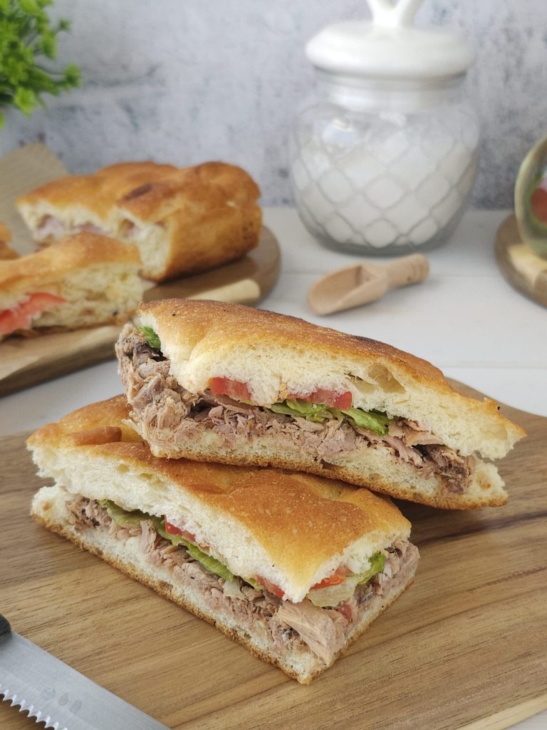 Une fois la focaccia refroidie, la couper en deux et garnir la base avec de la mayonnaise, du thon, des tomates et de la salade. La couper en morceaux et servir. J’espère que vous aimerez ma dernière recette, à la prochaine les amis.