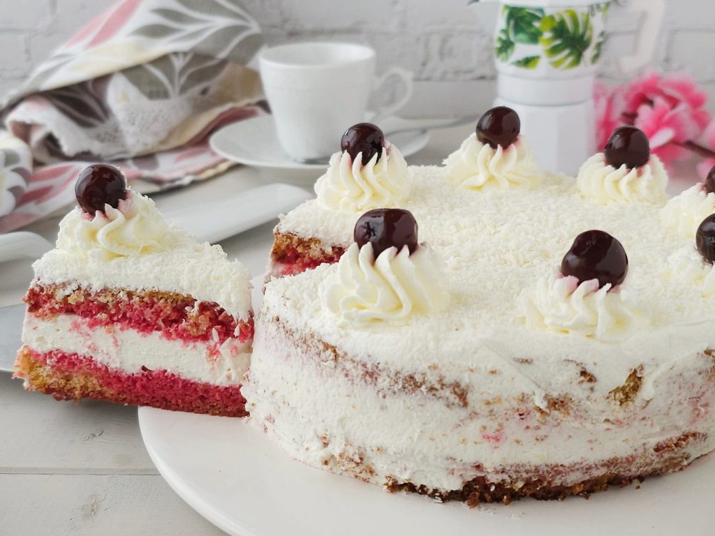 Et voilà, le gâteau à la crème fouettée et alchermes est prêt à être dégusté. J’espère que vous apprécierez ma dernière recette, à la prochaine les amis.