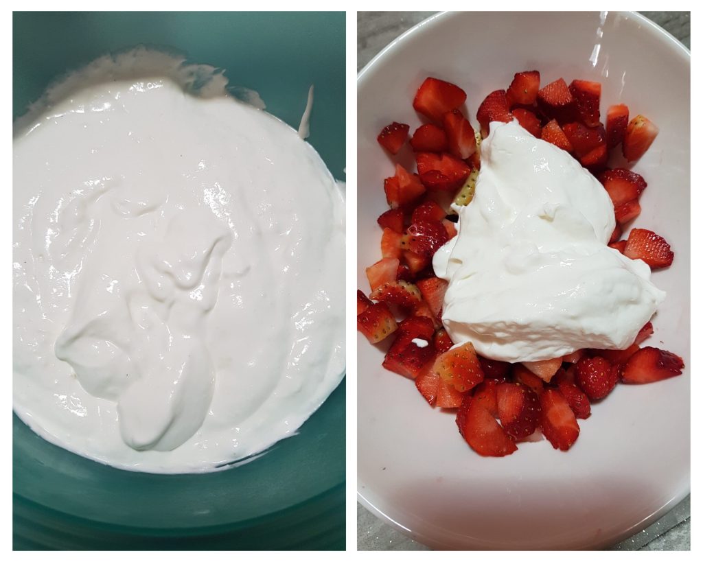 Commencez par réaliser le sirop au rhum. Porter à ébullition l’eau et le sucre dans une casserole. Lorsque le mélange a refroidi, ajouter le rhum et mélanger avec un fouet. Laisser à température ambiante. Laver et couper les fraises en dés, les verser dans la crème au lait et mélanger soigneusement.
