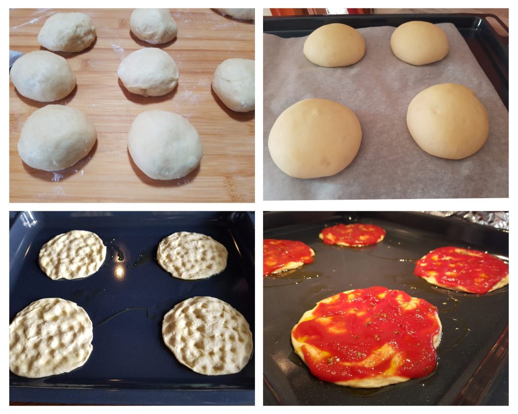 • Lorsque la pâte a levé, former des petites boules ou sphères ou pâtons d’environ 60 g chacune, les disposer sur une plaque recouverte de papier cuisson et laisser lever à température ambiante pendant environ 1 heure. Après la levée, reprendre les pâtons, les disposer et les aplatir avec les doigts sur une plaque bien huilée, sur la surface de la mini-pizza étaler une généreuse cuillère de purée de tomates, l’origan, une pincée de sel et un généreux filet d’huile. Cuire ensuite dans un four chaud, en mode statique ou ventilé ou à la fonction pizza à puissance maximale, mon four atteint 250ºC pour environ 10-15 minutes. Conseil de cuisson : placer la plaque sur le premier niveau en partant du bas mais aussi sur le sol. Après 8-10 minutes, tourner la plaque, ou du moins lorsque les mini-pizzas commencent à colorer d’un côté. Puis déplacer la plaque au milieu du four et terminer la cuisson.