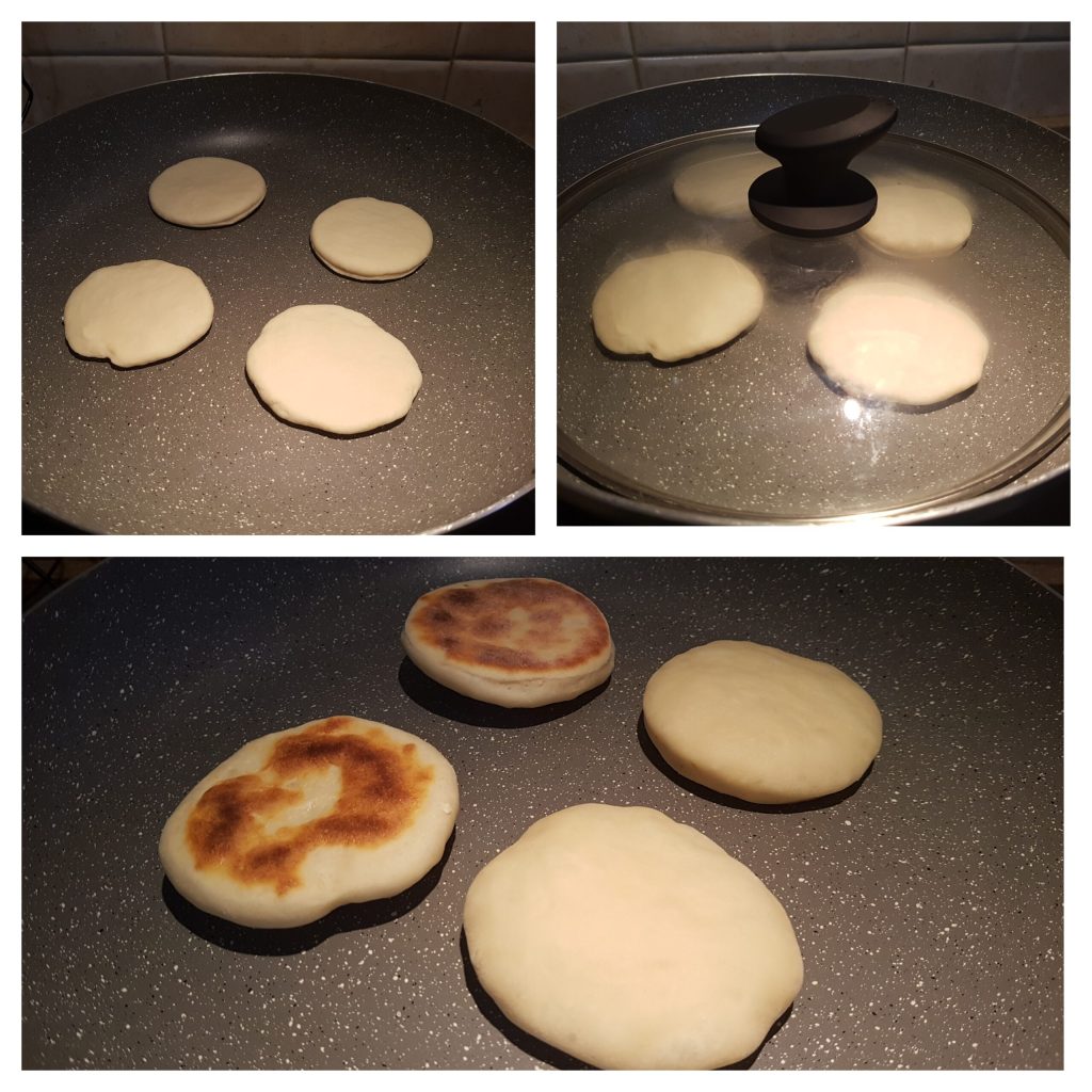 Huilez légèrement une poêle et éliminez l’excès avec du papier absorbant, chauffez bien la poêle et déposez les petites focaccias, couvrez et faites cuire chaque côté, il faudra environ 8-10 minutes par côté à feu moyen-doux.