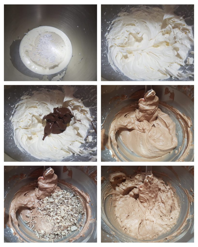 Dans un saladier, verser le mascarpone, le sucre glace et la crème (tous les ingrédients bien froids du frigo) et les monter pendant quelques minutes à l’aide des fouets électriques. Ajouter le Nutella et continuer à monter. Enfin, ajouter les gaufrettes hachées au couteau dans la crème au mascarpone et mélanger soigneusement. Une fois la farce prête, mettre au frigo pour reposer pendant 1 heure.