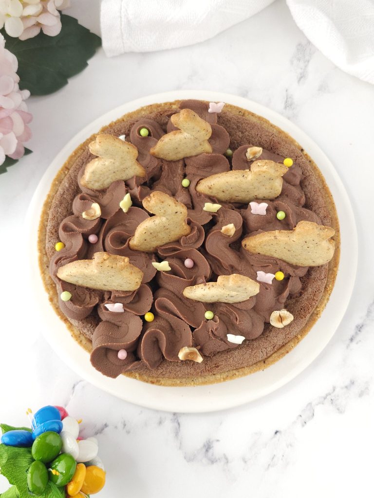 • Avec précaution, démouler la tarte de son moule ou anneau et la déposer sur un plat de service. Décorer enfin la surface de la tarte avec la ganache montée. J’ai utilisé une poche à douille munie d’une douille Saint Honoré. Décorer ensuite avec les biscuits, les noisettes et les sucreries. Et voilà, la tarte moderne de Pâques est prête. J’espère que vous aimerez ma dernière recette, à la prochaine mes amis.