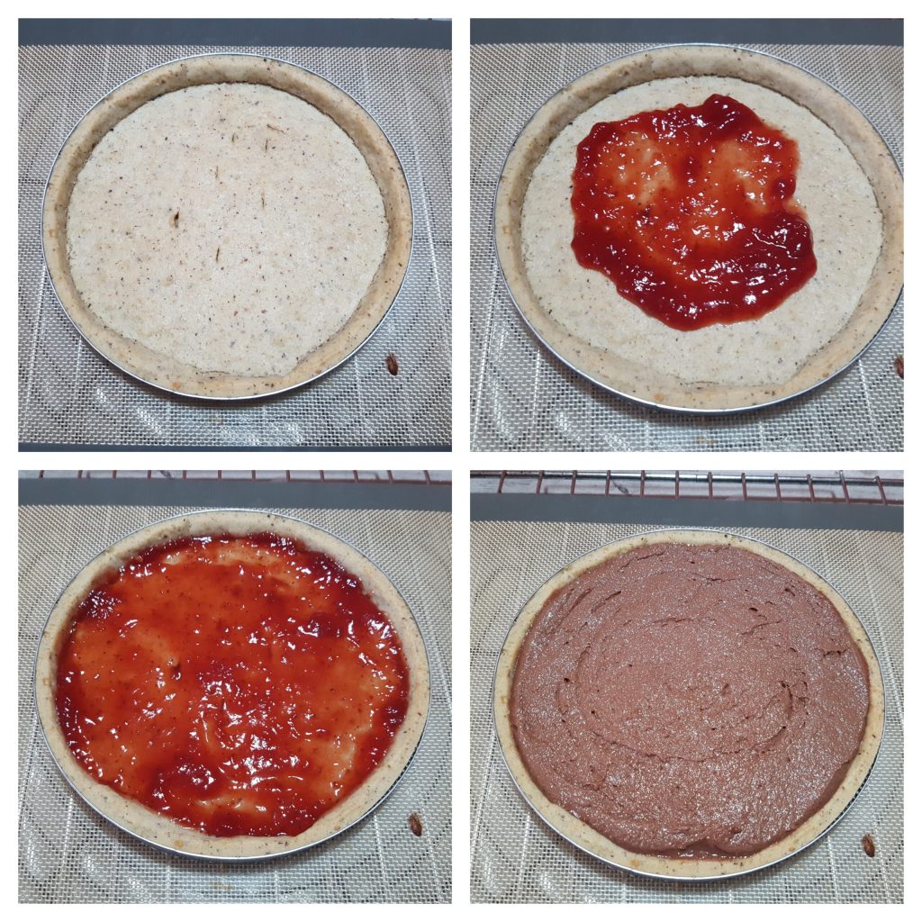• Reprendre la tarte du réfrigérateur, étaler au fond de la pâte sablée une couche de confiture de framboises et cuire au four statique chaud à 170° pendant 20 minutes. Sortir le moule du four, déposer la couche de crème frangipane au chocolat et bien lisser.