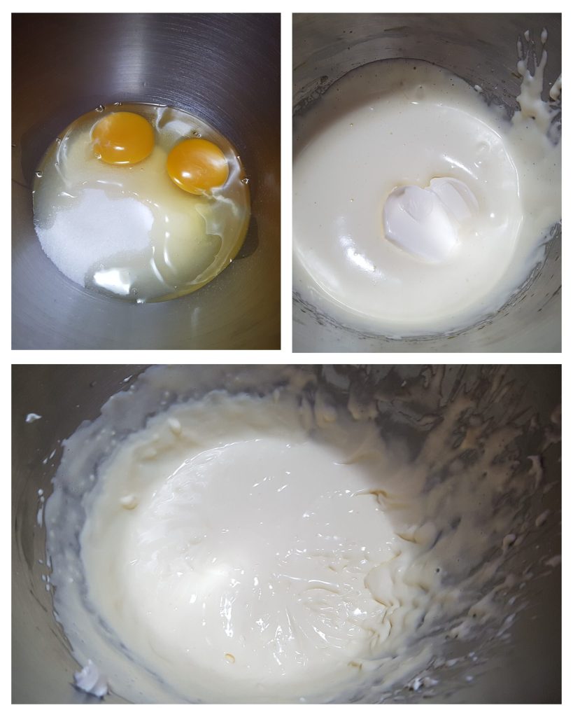 • Dans un saladier, fouettez avec les fouets électriques les œufs avec le sucre et la vanille pendant 10 minutes. Versez le mascarpone et fouettez encore jusqu’à obtenir un mélange lisse et homogène.
