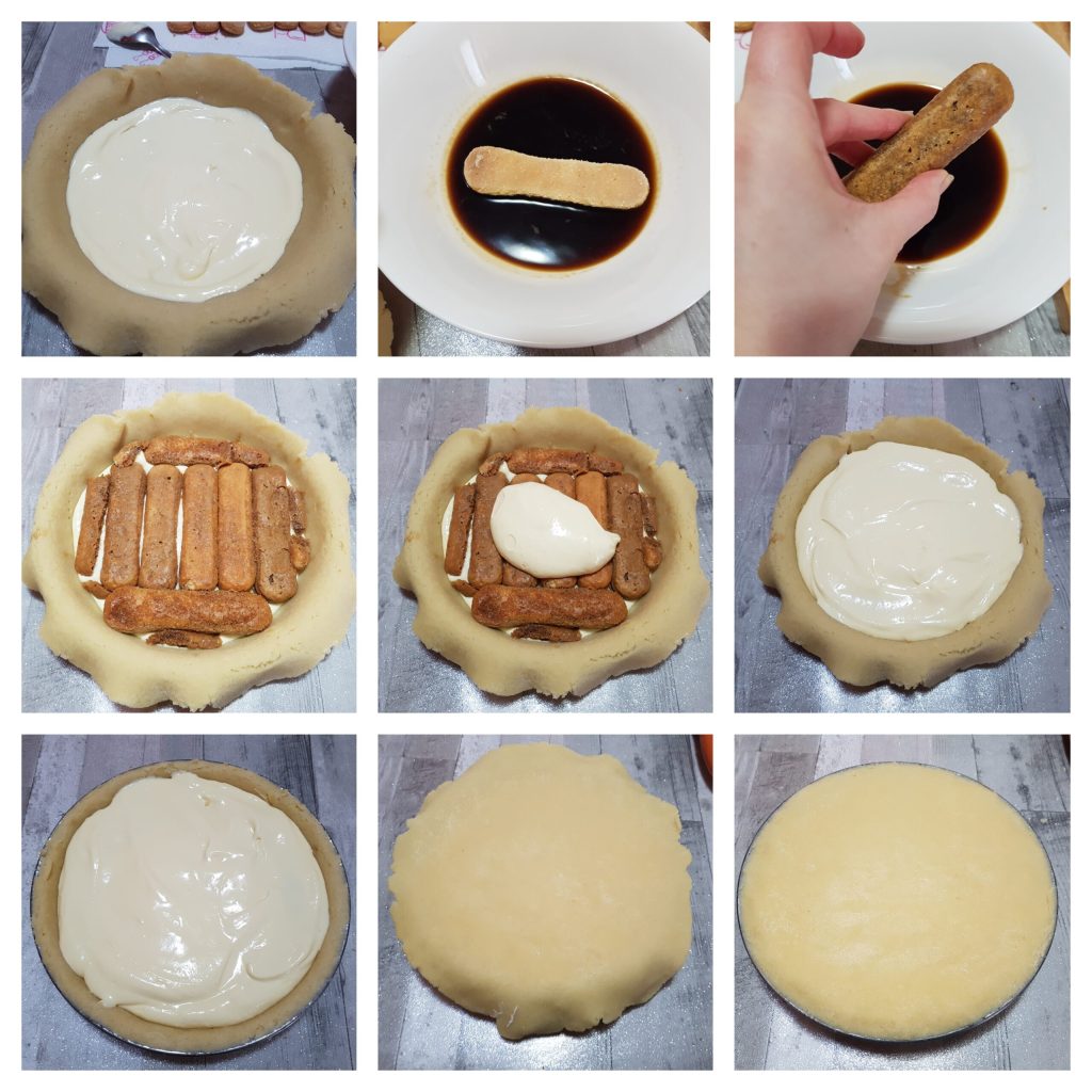 • Reprenez le moule tapissé de pâte sablée et versez la moitié de la crème au mascarpone, trempez les boudoirs dans le café et disposez-les sur la crème. Enfin, versez le reste de la crème et nivelez bien. Coupez l’excédent de pâte sablée sur les bords. Pour finir, étalez le reste de pâte sablée et fermez la tarte avec cette croûte en scellant bien les bords vers l’intérieur. Faites cuire dans un four préchauffé à 180° pendant 45 minutes. Niveau bas du four. Une fois cuite, éteignez, sortez du four et laissez refroidir.