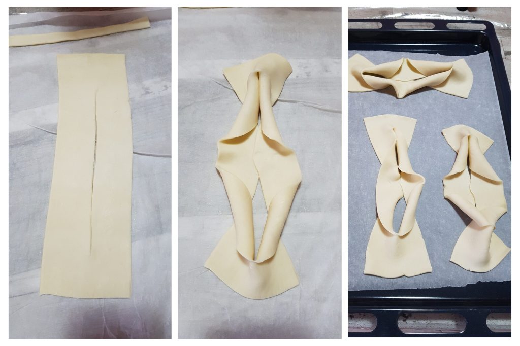 Dérouler la pâte feuilletée et découper 4 rectangles, cela dépend de la taille de votre pâte. Et à partir des rectangles obtenus, créer une bande centrale avec une roue dentelée et insérer un bord au centre en le passant sous la bande centrale, puis l’autre bord, obtenant ainsi une forme de torsade-noeud (comme lorsque nous réalisons les bugnes classiques ou les merveilles de carnaval). Les déposer sur une plaque recouverte de papier sulfurisé. Avec cette quantité, on en obtient 4, cela dépend toujours de la taille de la pâte que vous utilisez.