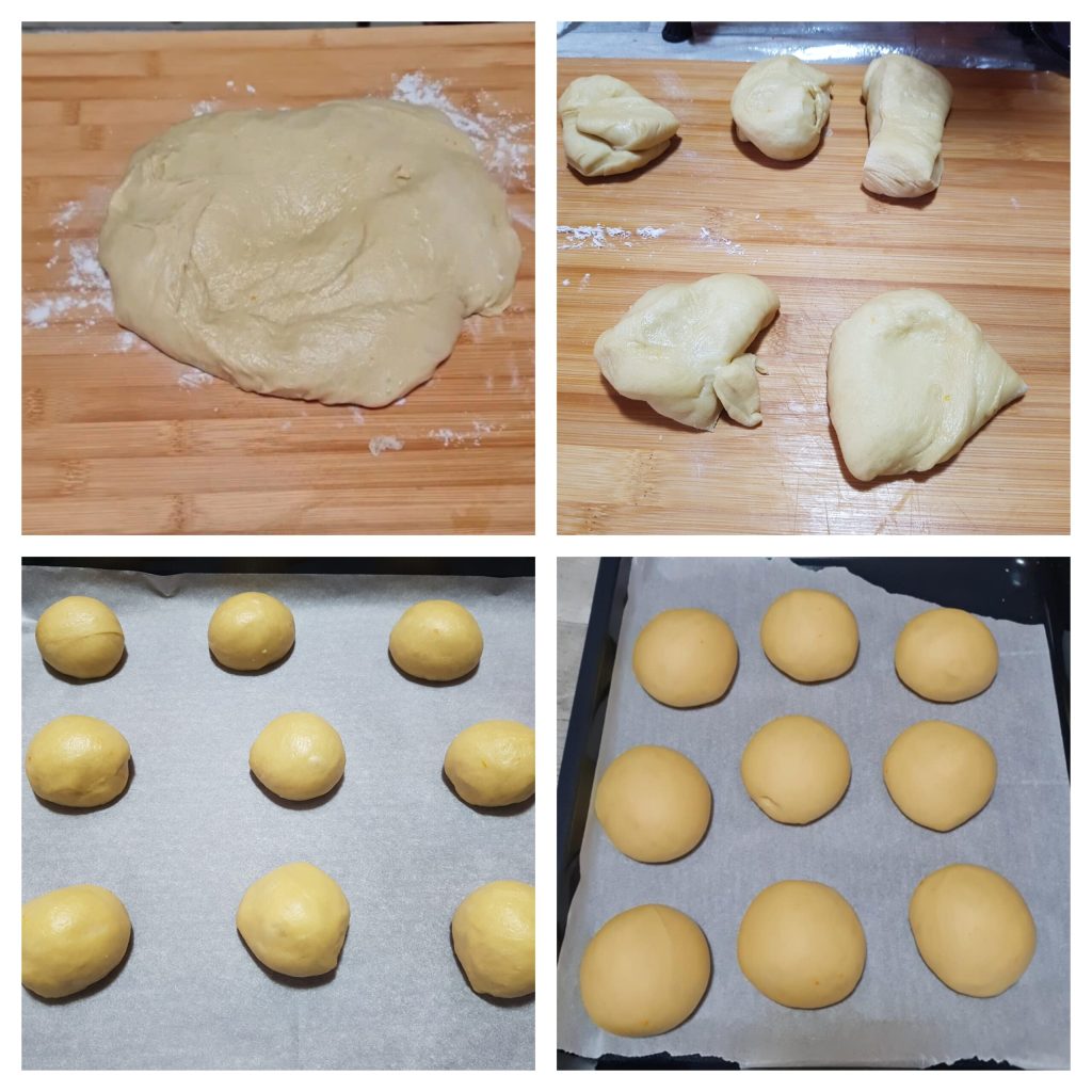 Après la levée, la pâte aura doublé de volume. La renverser sur un plan de travail. Avec les mains, la dégazer délicatement. Maintenant, prendre délicatement des morceaux de pâte et former des boules d’environ 80-90 g chacune. Placer les brioches sur une plaque recouverte de papier cuisson et laisser lever à nouveau pendant 1 à 2 heures ou jusqu’à ce qu’elles doublent de volume.