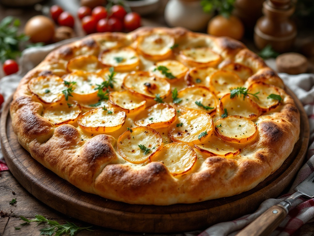Les pommes de terre tranchées non seulement donnent un aspect rustique et attrayant à la focaccia, mais créent aussi une croûte croquante qui se marie parfaitement avec la douceur de l’intérieur. De plus, elles absorbent l’huile d’olive et les herbes aromatiques, libérant une saveur intense et enveloppante. C’est une excellente variante à la focaccia classique.
