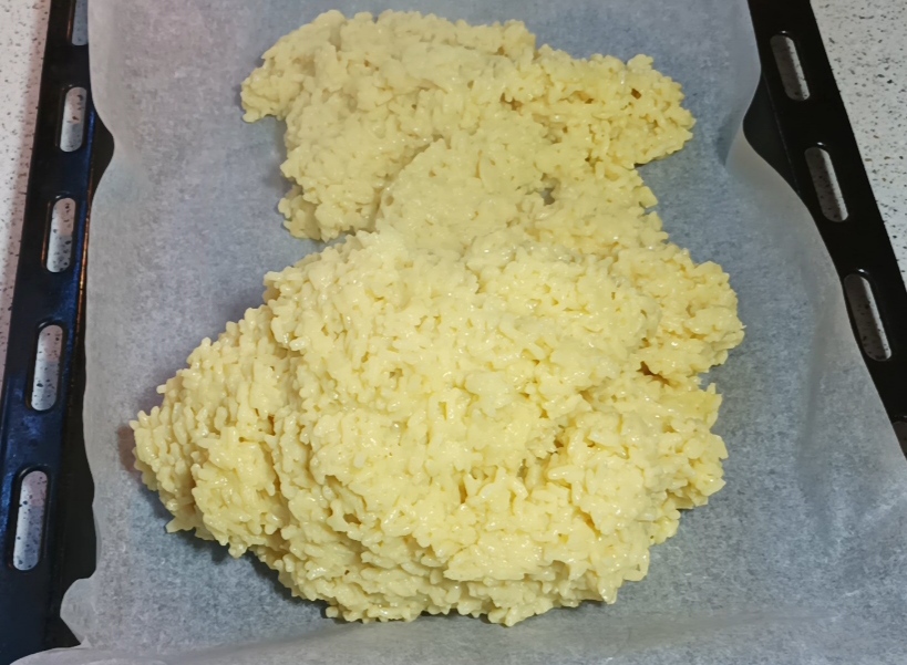 Après le temps de cuisson, éteignez le feu et ajoutez le beurre et le parmesan. Remuez bien jusqu’à ce que le beurre soit fondu. Préparez la plaque de cuisson avec du papier sulfurisé et versez le riz.