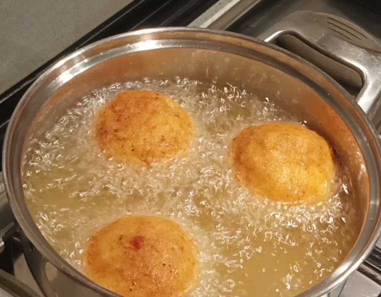 Dans la poêle, mettez beaucoup d’huile, faites monter à température (180°) et mettez les arancine. Faites-les dorer d’un côté puis retournez-les, faites frire environ 3 minutes de chaque côté.