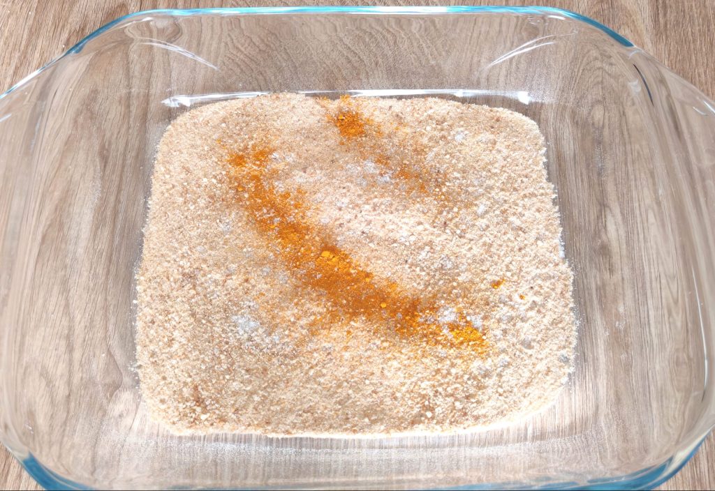 • Dans un récipient, mettez la chapelure et assaisonnez-la avec le curcuma, l’ail en poudre et le sel.