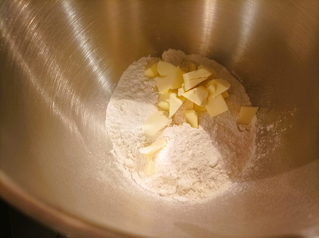 Dans un robot pâtissier ou à la main, mettez la farine, le sucre, la levure et le beurre ramolli. Activez le robot avec le crochet K et pétrissez quelques minutes.