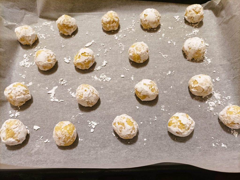 Sur une plaque de cuisson, posez du papier sulfurisé et déposez les boules de pâte, en les espaçant légèrement. Enfournez à 170°C dans un four ventilé chaud pendant 15 minutes. À la fin de la cuisson, ils seront dorés avec des fissures en surface.
