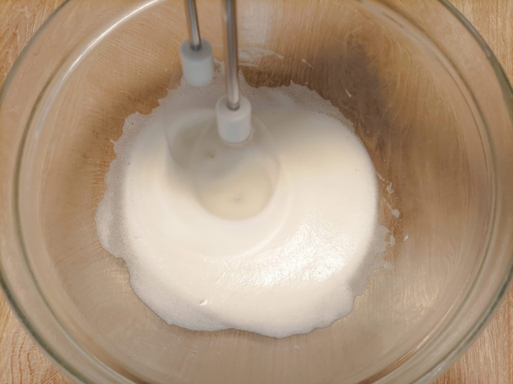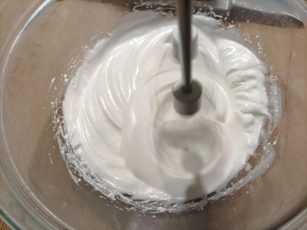 À 121°, éteignez le feu. Maintenant, réduisez la vitesse des fouets et versez le sirop petit à petit, puis augmentez progressivement en battant pendant environ 10 minutes.