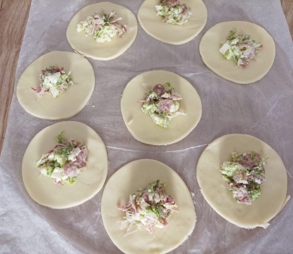 Avec une cuillère à café, ajoutez un peu de garniture dans chaque cercle, en laissant les bords vides sinon ils ne se fermeront pas.