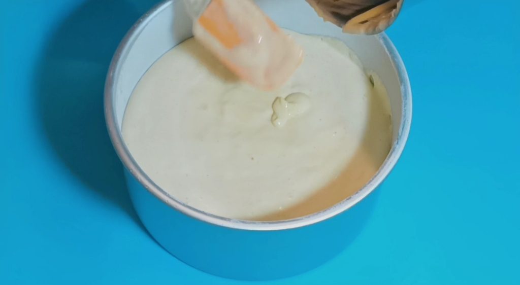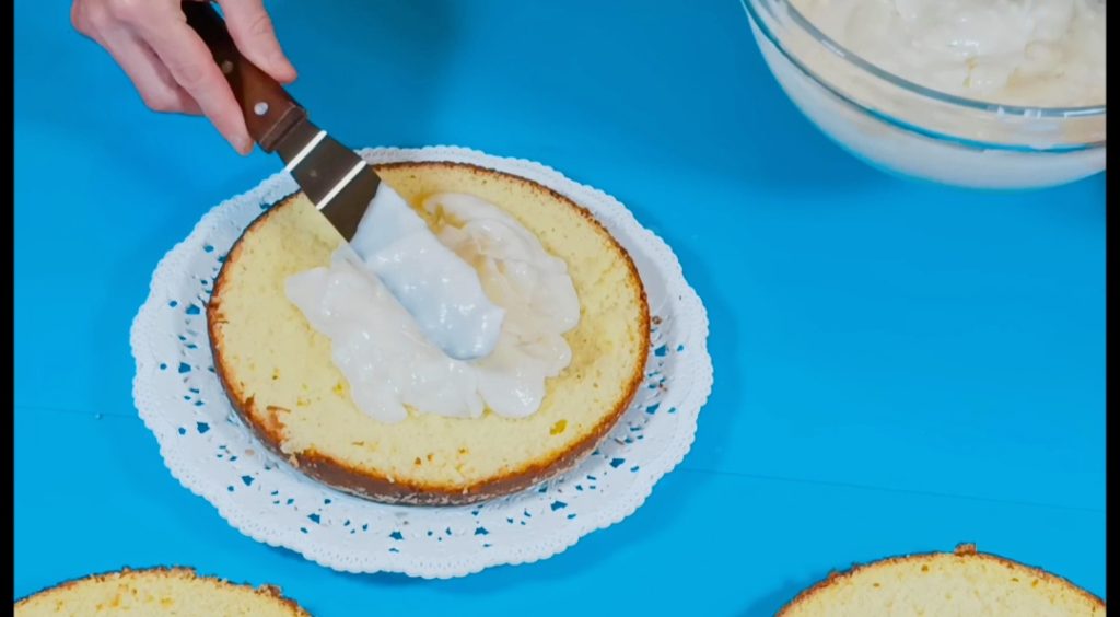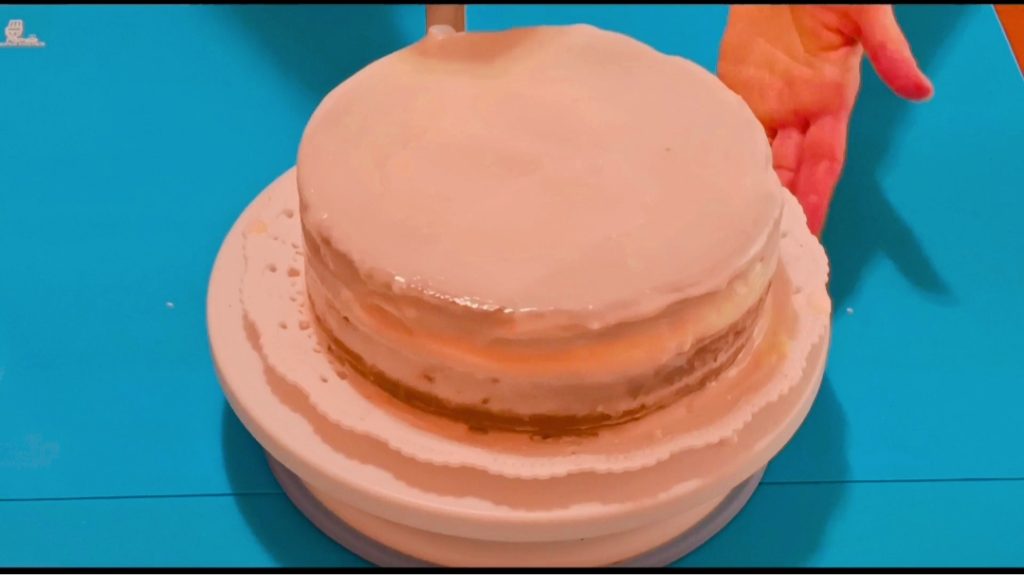 À ce stade, vous pouvez décider de la couvrir comme vous préférez, crème au beurre, ganache au chocolat ou crème fouettée. J’ai utilisé la crème qui me restait de la garniture en ajoutant 2 cuillères à soupe de lait concentré. Mettez la crème sur le disque et étalez-la doucement sur toute la surface et les côtés, évidemment n’étant pas dense comme d’autres couvertures, elle peut tomber un peu sur les côtés, mais elle se solidifiera rapidement.
