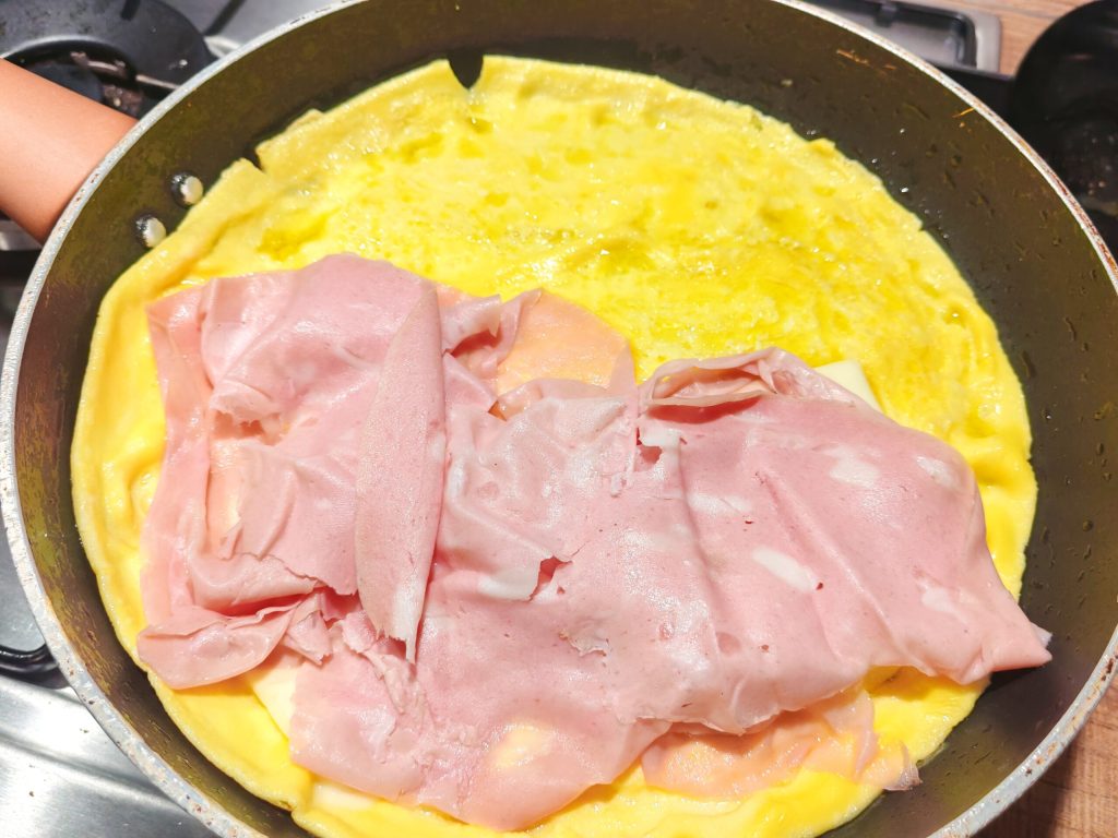 Après les 5 minutes, éteignez le feu et garnissez l’omelette avec les ingrédients choisis, dans mon cas, j’ai ajouté d’abord les tranches de fromage fondu puis la mortadelle.